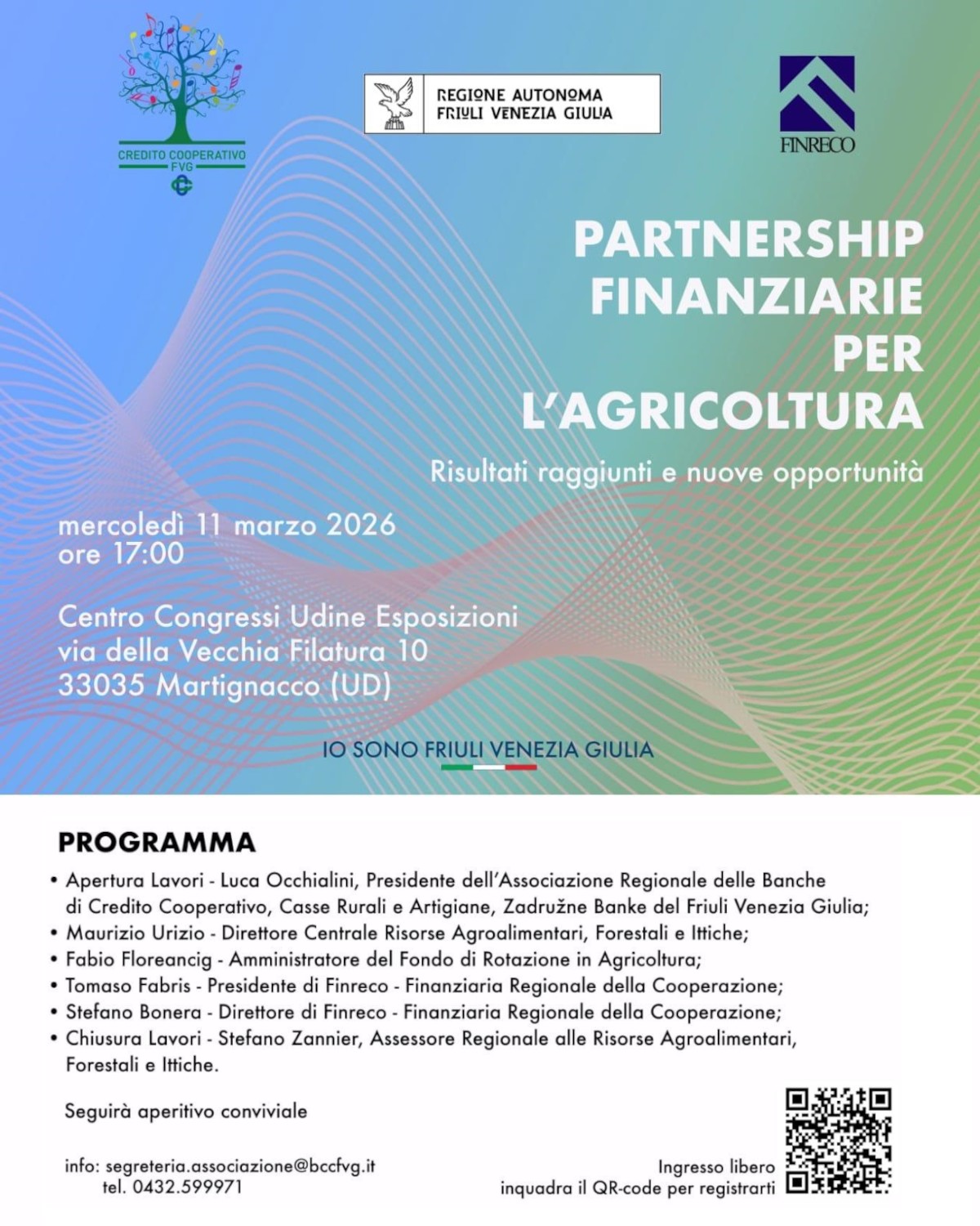 Il convegno offrirà una panoramica sulle principali iniziative finanziarie a supporto del settore agricolo regionale, presentando i risultati ottenuti e le nuove opportunità attivabili grazie alla collaborazione tra sistema del credito cooperativo, Regione FVG e Finreco.